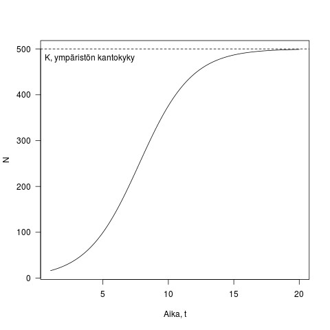 Tätä kutsutaan logistisen kasvun yhtälöksi. Lukijat ovat saattaneet törmätä siihen sellaisessa muodossa, jossa \frac{r}{\alpha} = K, termiä K nimitetään usein ympäristön kantakyvyksi. Olen esittänyt tämän yhtälön muodossa jossa K:lle on annettu mekanistinen perusta, näimme kohta tämän esitystavan hyödyt. Kuvassa 2 on esimerkki logistisesta kasvusta, populaation kasvu on ensin nopeaa, mutta tiheyden kasvaessa kasvu hidastuu kunnes lopulta pysäähtyy kun populaatio saavuttaa ympäristön kantokyvyn.