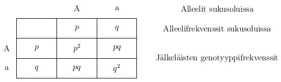 Taulukoidaan alleelien mahdolliset tavat yhdistyä kuten edellä. Nyt kuitenkin käytämme alleelifrekvensseja painokertoimina kertomaan kuinka paljon jokaista genotyyppiä on seuraavassa sukupolvessa.